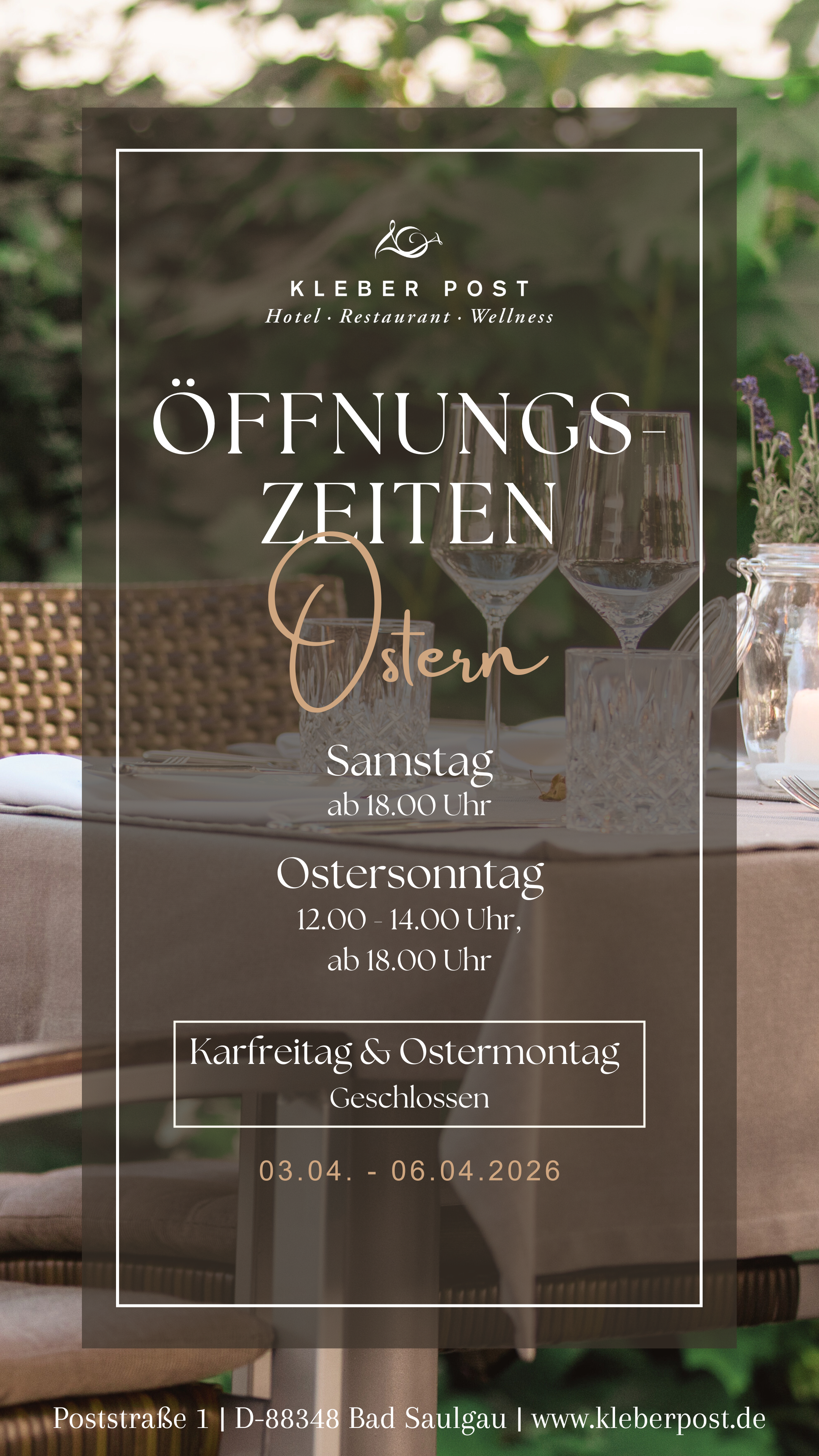 Das Hotel und Restaurant Kleber Post in Bad Saulgau liegt in einer der reizvollsten Urlaubsregionen Deutschlands und mit einem Kaleidoskop an Arrangements, als auch mit den individuellen Offerten, hat das Haus für jeden Gast, zu den verschiedensten Anlässen das Passende im Programm. Ein einzigartiger Gastgeber in Oberschwaben!